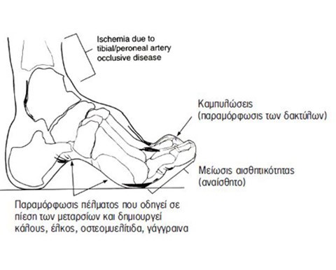 Με τον όρο «διαβητικό πόδι» εννοούμε αλλοιώσεις στο πόδι που γίνονται από τον αστράγαλο µέχρι και τα δάκτυλα. Στην πραγματικότητα, το πέλμα στρέφεται προς τα κάτω και τα δάκτυλα κάμπτονται προς τα πάνω.